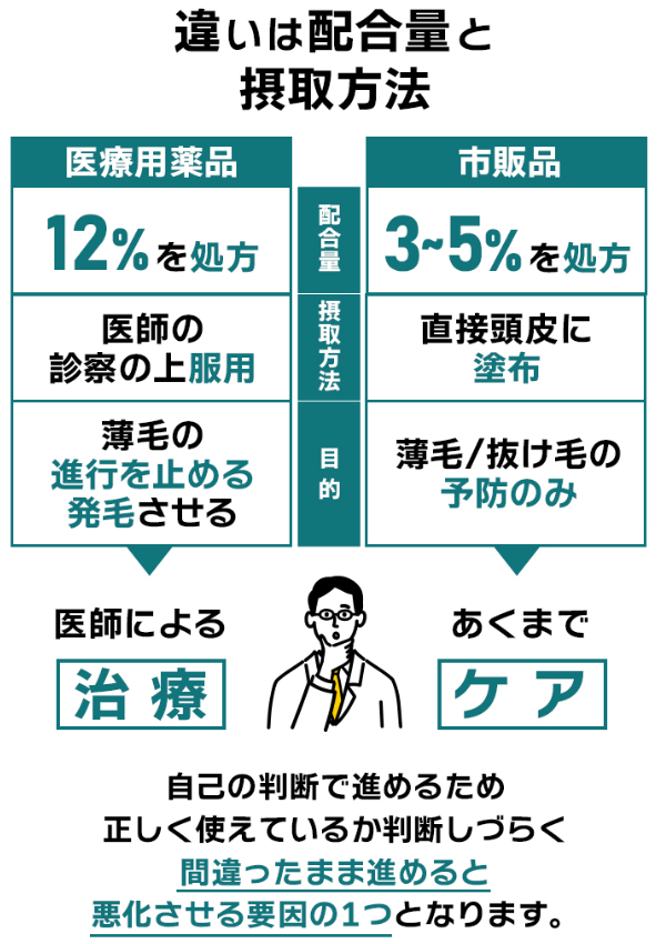 市販の育毛剤ではAGAの有効成分の配合量が少ない上に、薄毛抜け毛の予防のみでAGAを改善させることはできないんです!