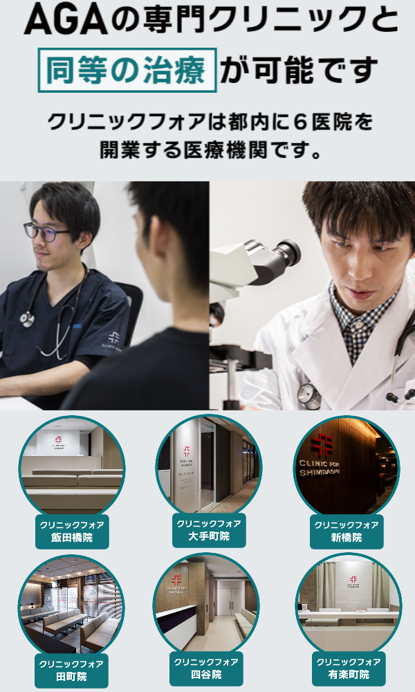 それはクリニックフォアは都内に6院を展開する医療機関で、患者さんにピッタリな治療プランの提案とAGAに効果があるお薬を処方してくれるからなんです!