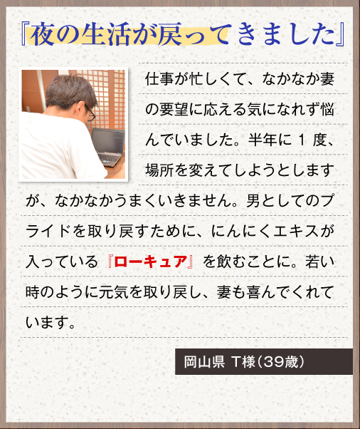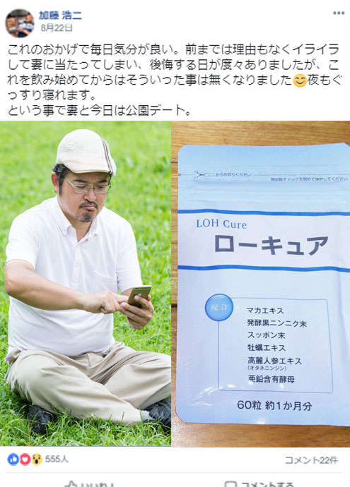 『ローキュア』には、男性の健康に欠かせない成分がたっぷり入っていて巡りのある生活を助けてくれて、イキイキとしたアクティブな毎日をサポートしてくれるはずです!