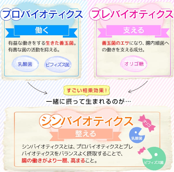 1つ目は「実際に働く善玉菌(プロバイオティクス)」と「そのエサ(プレバイオティクス)」を一緒にカプセルに入れることですごい効果を発揮するということ。