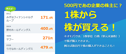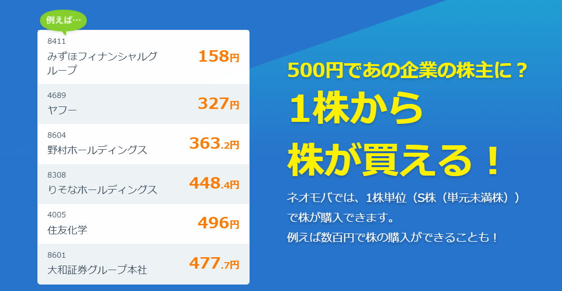 でもネオモバなら1株単位で有名企業の株を数百円から買うことが可能なんです!!