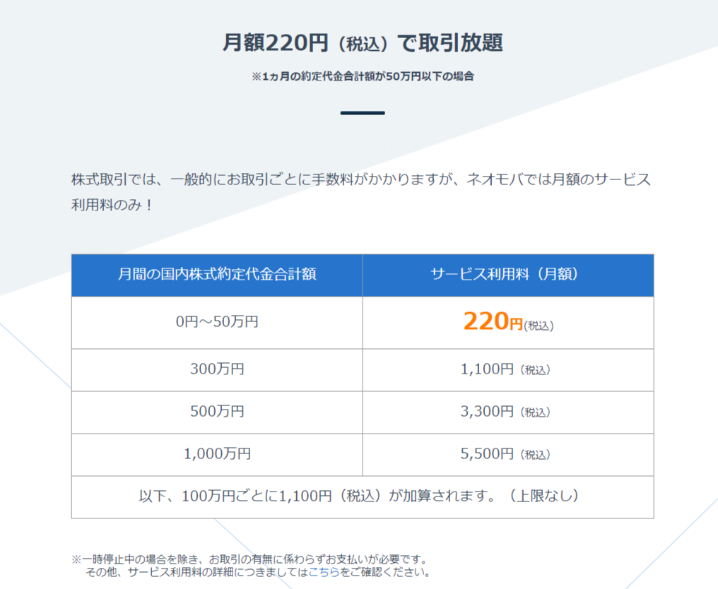 しかし、ネオモバは毎月220円(税込)〜の月額利用料のみなので、取引額が50万円以下ならたった220円(税込)で取引し放題です。