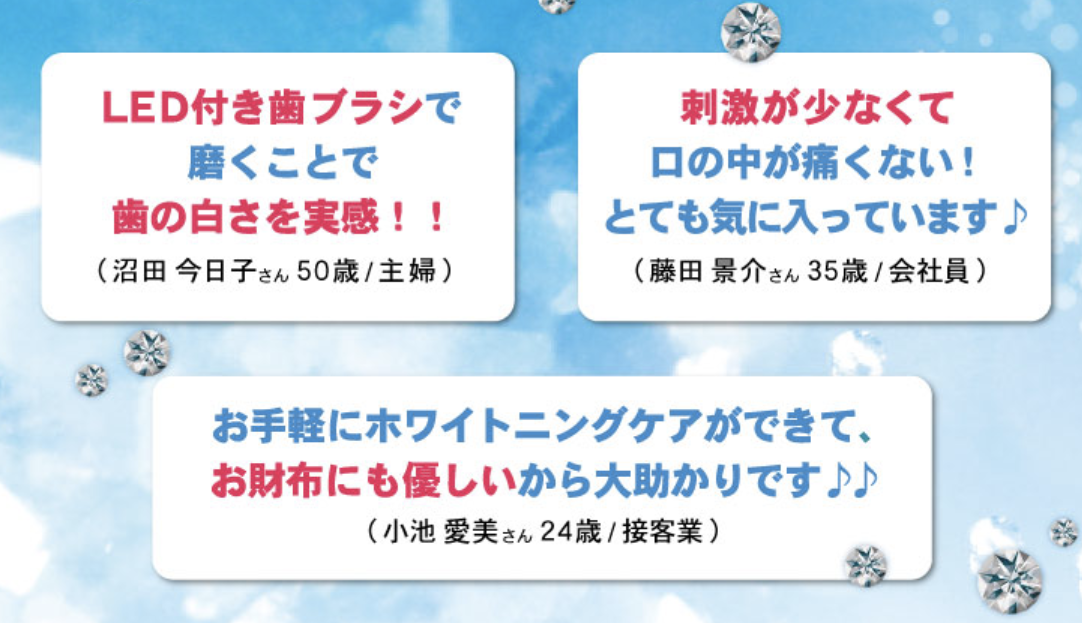 歯が白くなってからいいことづくめ!ZEROクリスタルを使ってからは歯にまつわるコンプレックスが解消され自分に自信が持てるように!! 異性との交流にも積極的になれました。 おかげで彼女も出来たし歯が見えても大丈夫になったので本当に楽しい毎日を過ごしています!
